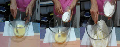 sempre mescolando metti la farina di grano tenero e la farina di riso.